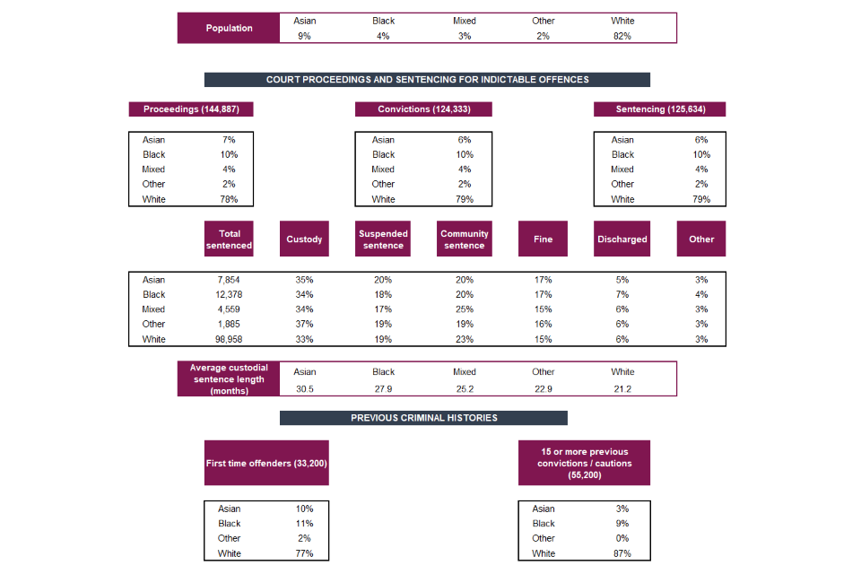 This publication compiles statistics from data sources across the Criminal Justice System (CJS), to provide a combined perspective on the typical experiences of different ethnic groups. No causative links can be drawn from these summary statistics. For the majority of the report, no controls have been applied for other characteristics of ethnic groups (such as average income, geography, offence mix or offender history), so it is not possible to determine what proportion of differences identified in this report are directly attributable to ethnicity. Differences observed may indicate areas worth further investigation but should not be taken as evidence of bias or as direct effects of ethnicity.