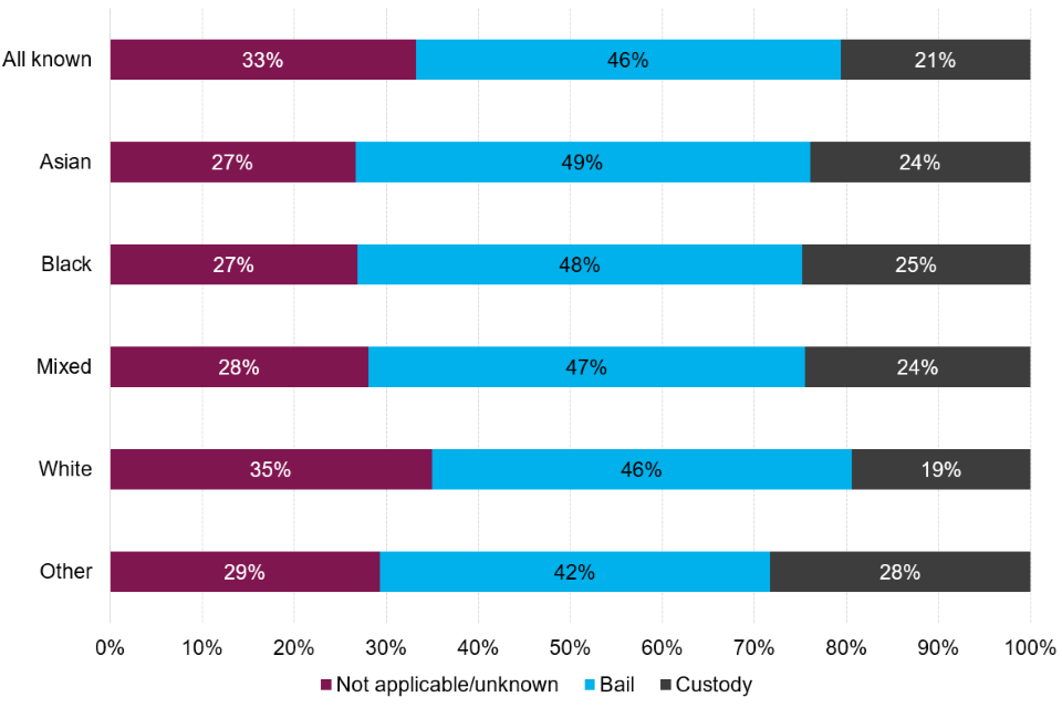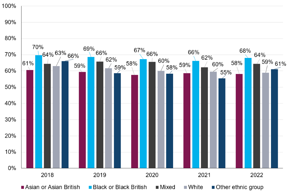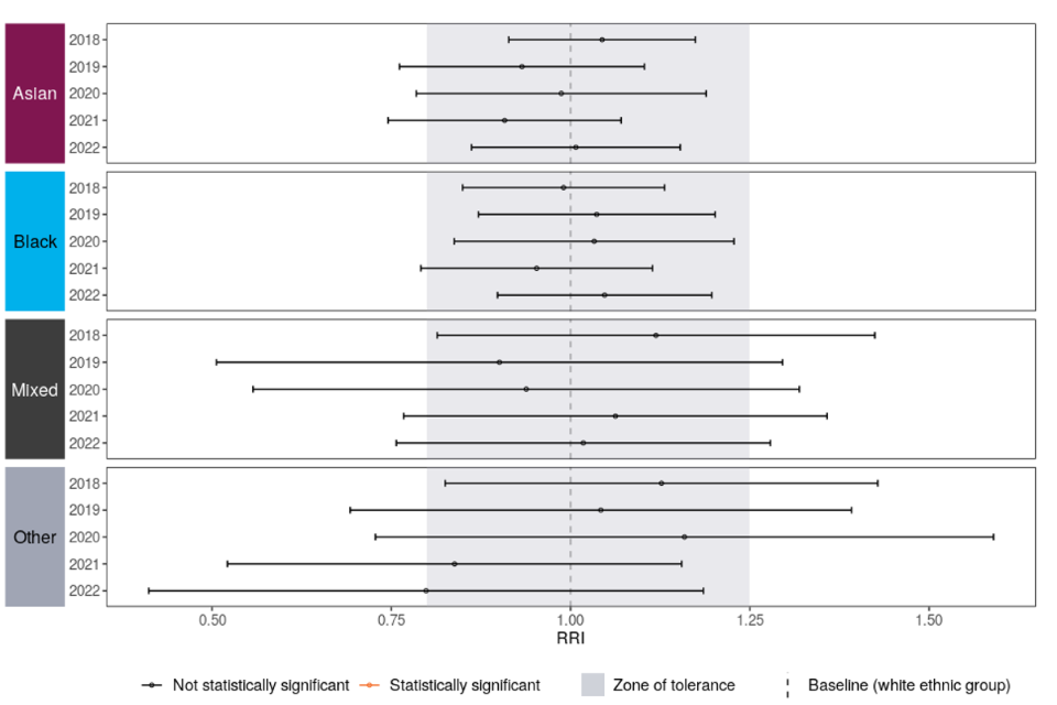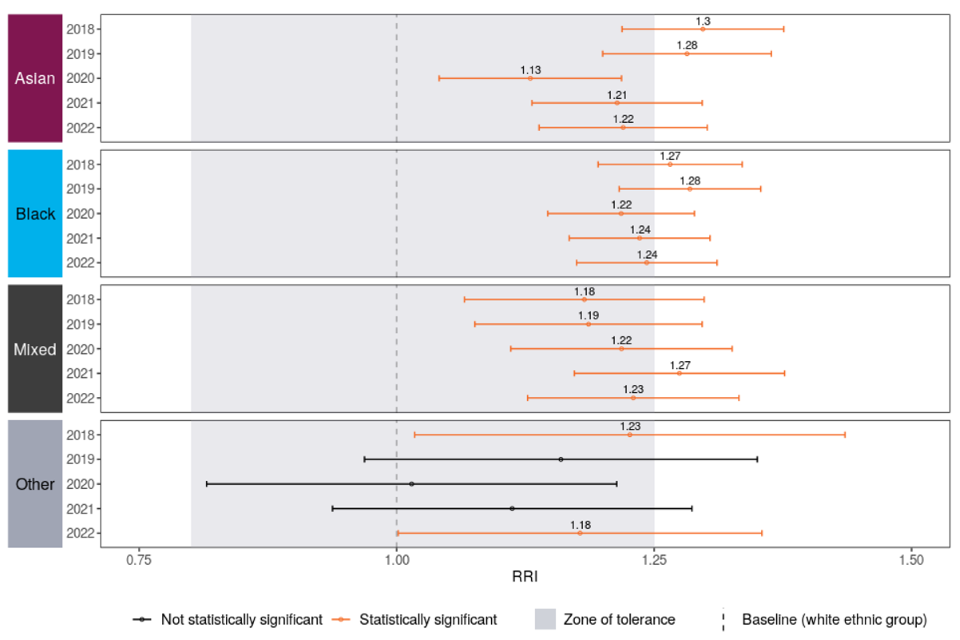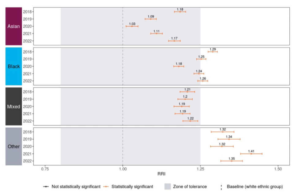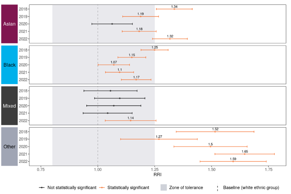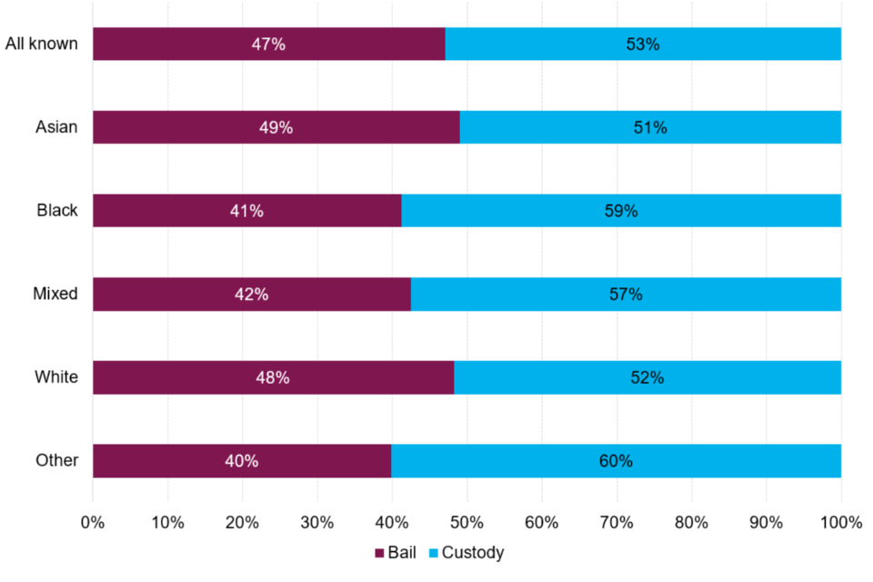 Every effort is made to ensure that the figures presented are accurate and complete. However, these data have been extracted from large administrative data systems and surveys generated by the courts, police forces and other agencies, so some care should be taken, in particular when considering small differences and or sample sizes. Where possible, this report takes into consideration the recommendations of the Lammy Review (a 2017 independent review into the treatment of, and outcomes for black, Asian and Minority Ethnic individuals in the criminal justice system). This includes putting more information in the public domain with ethnicity breakdowns, the use of the Relative Rate Index[footnote 8] where appropriate and a focus on outcomes for children distinct form the adult population.