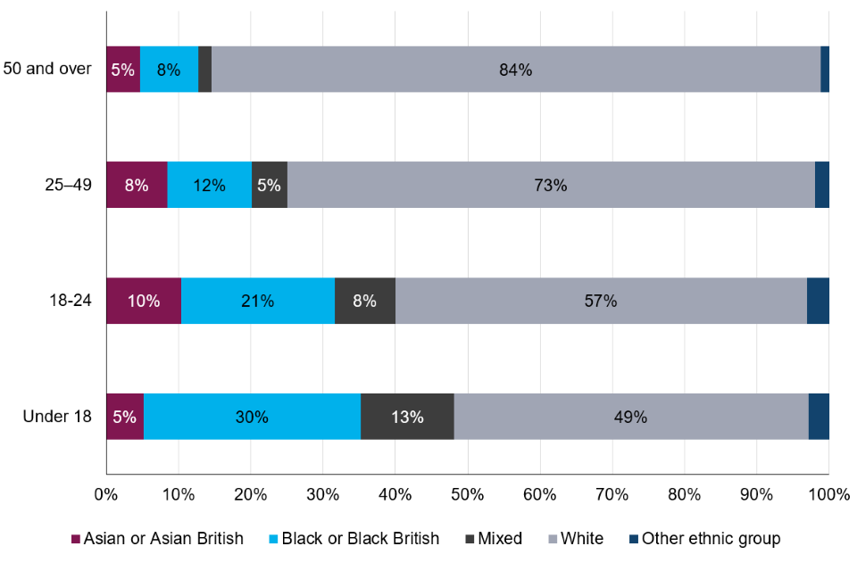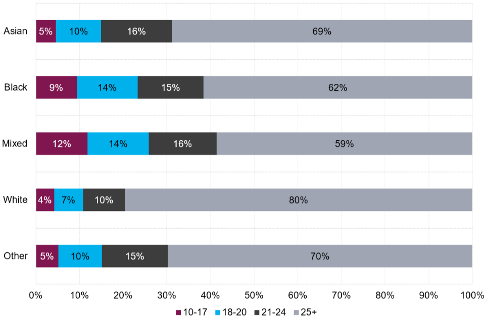 | A higher proportion of prosecutions for mixed and black ethnic groups were against children, 12% and 9%, respectively, compared to 4% for defendants from the white ethnic group. | In 2022, children from the black ethnic group received longer custodial sentences, at 23.8 months on average, an increase of 3.6 months compared to 2018 (20.2 months). |