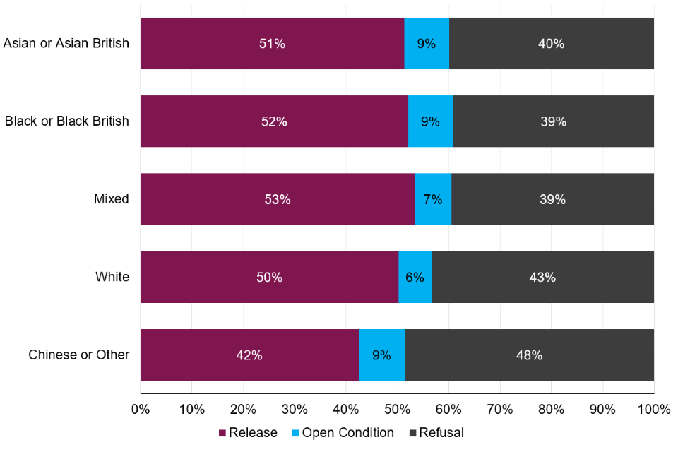 Ethnicity was known in 99.79% of oral parole board hearings in the year ending March 2023. Cases where ethnicity was not known have not been included in this commentary. ↩