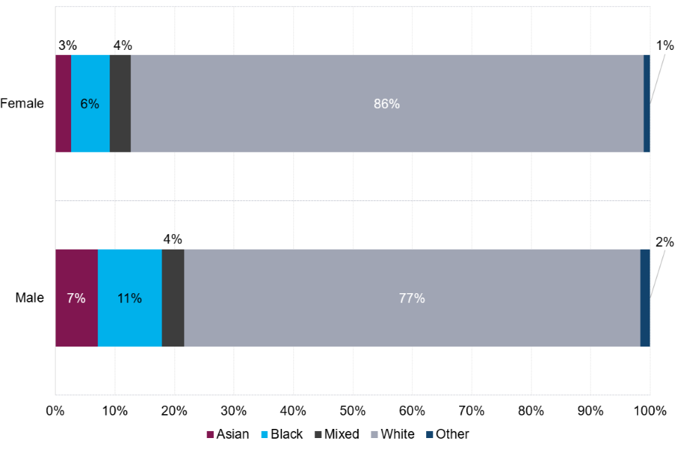 | In 2022, 77% of all males prosecuted for indictable offences were from the white ethnic group, compared to 86% of all females prosecuted. | The proportion of defendants from the black ethnic group was 11% of all male prosecutions, compared to 6% of all female prosecutions. |