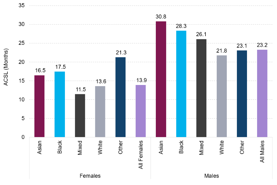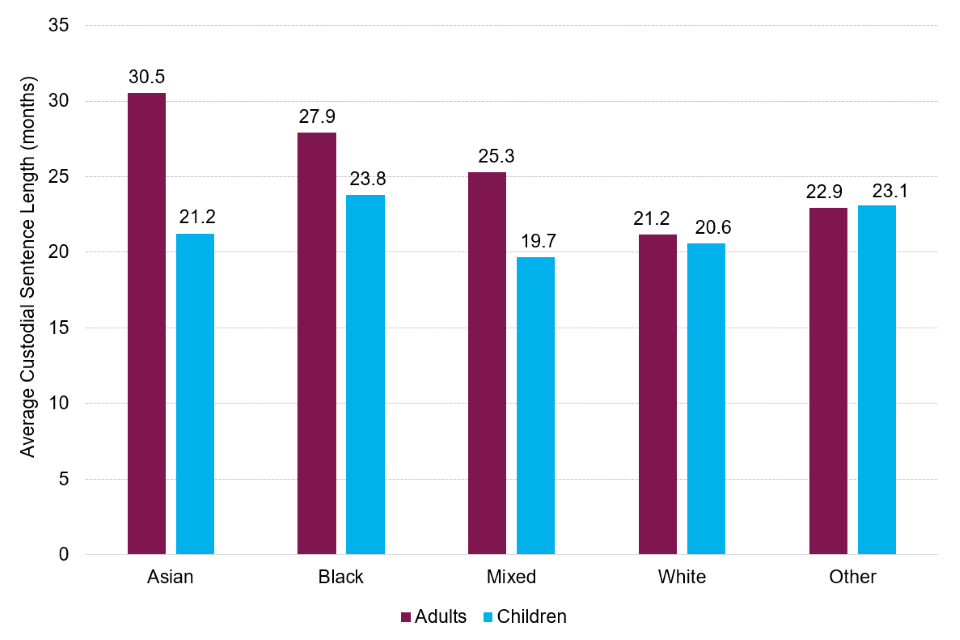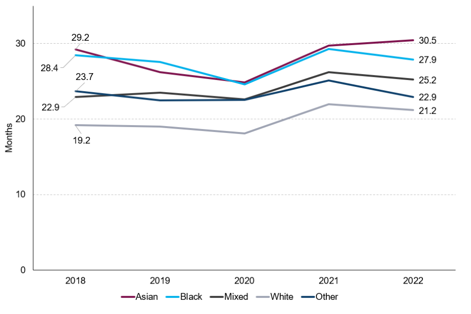 | Since 2018, white defendants have had a consistently lower average custodial sentence length (ASCL) than all other ethnic groups combined for indictable offences. | In 2022, white offenders had an ACSL of 21.2 months in comparison to 30.5 months for Asian offenders, 27.9 months for black offenders, 25.2 months for mixed offenders and 22.9 months for the other ethnic group. |
