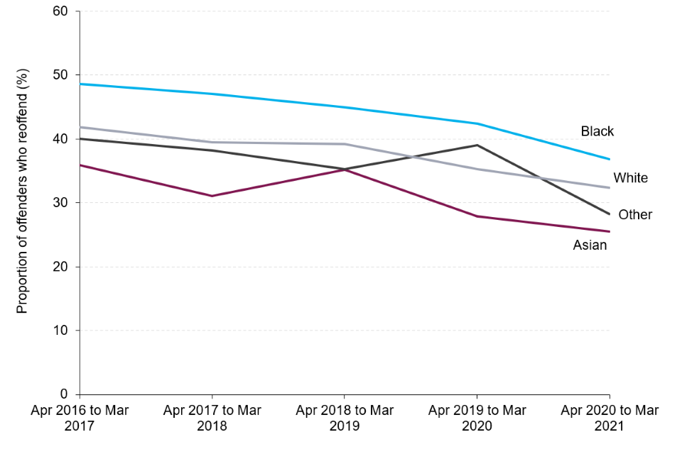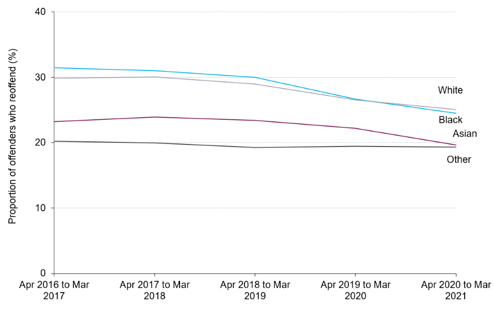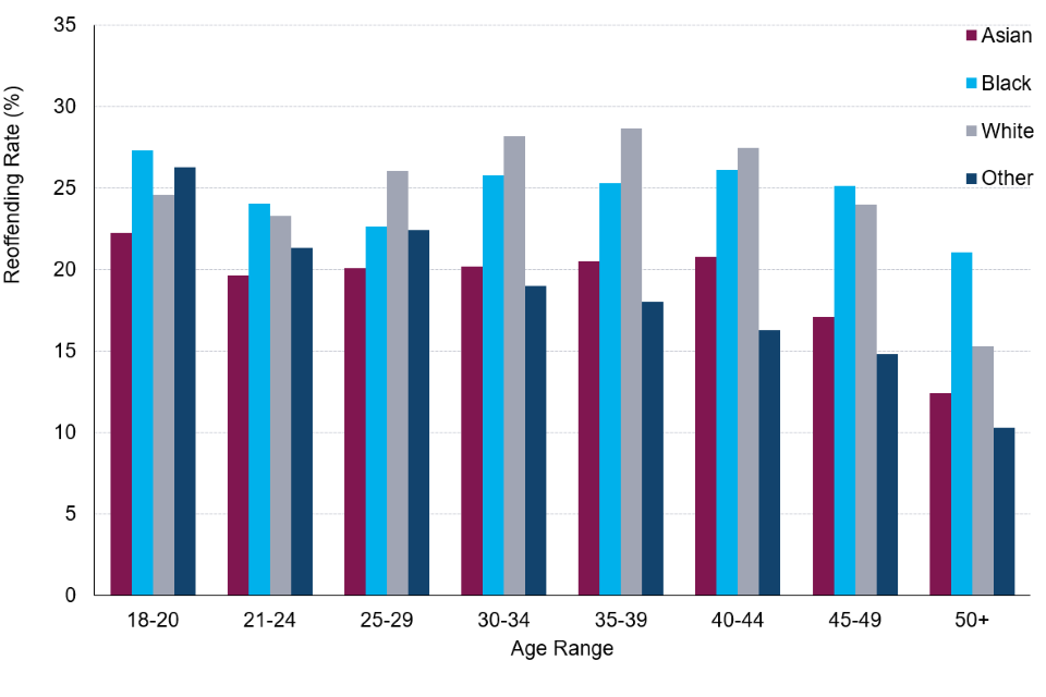 | The reoffending rate of adults was highest for those aged 18-20 for ethnic minorities (excluding white minorities). | The reoffending rate for offenders from the black, Asian, and other ethnic groups was highest for those aged 18-20. For offenders from the white ethnic group, those aged 35-39 presented the highest reoffending rate. |