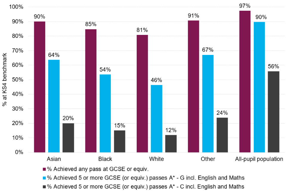 | The educational attainment of young people who were cautioned or sentenced for an offence was lowest for the white ethnic group, across all three measures. | Of young people from the white ethnic group matched to a KS4 attainment record in academic years 2013/14 and 2014/15, 12% achieved 5 or more GCSEs (or equivalents) graded A* to C, compared to other ethnic groups at 24%. |