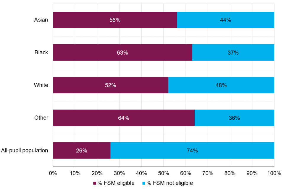 | More than half of young people who were cautioned or sentenced for an offence were eligible for Free School Meals (FSM) across all ethnic groups. | This was highest across young people from other ethnic groups, at 64%, followed by the black ethnic group at 63%, compared to the white ethnic group at 52%. This contrasts with the proportion of pupils in the all-pupil population where 26% were eligible for FSM. |