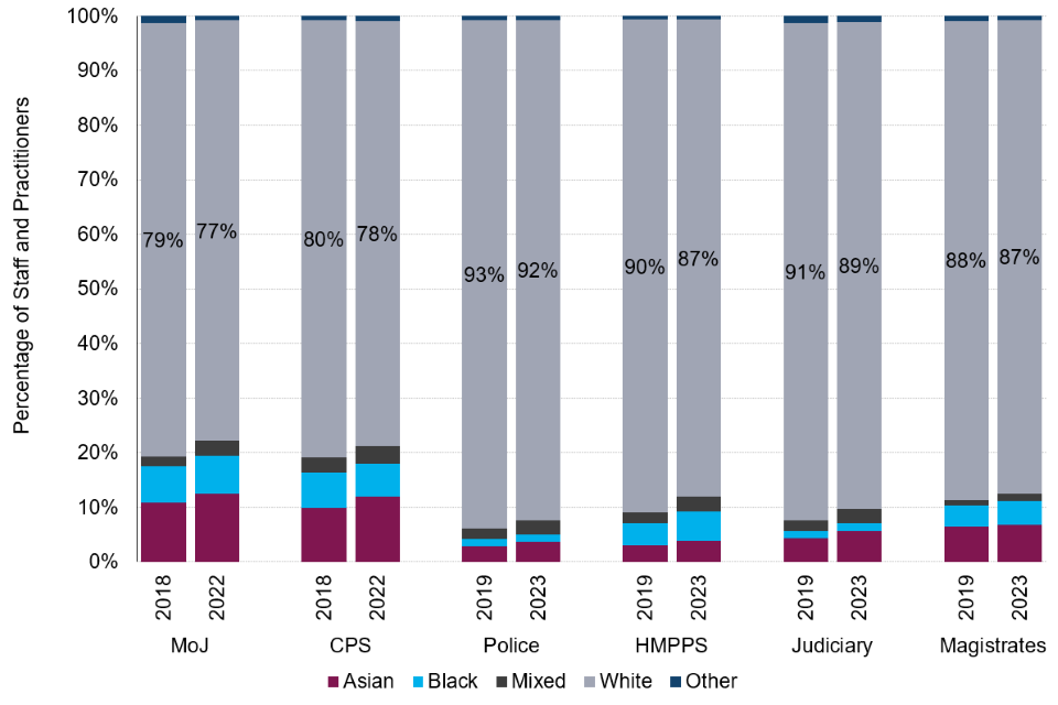 | The ethnic profile of practitioners in the Criminal Justice System (CJS) has become slightly more diverse over the last 5 years. | The proportion of staff from white backgrounds has decreased between 1 and 3 percentage points across all CJS organisations over the last 5 years, as a result of increases in the proportion of staff from all other ethnic groups. |