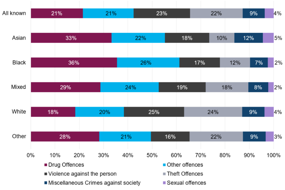| Convictions for drug offences accounts for the largest proportion of convictions for all other ethnic groups combined. | In 2022, the largest proportion of convictions for all other ethnic groups combined was for drug offences (28% to 36%), while the largest proportion of convictions for white defendants was for violence against person offences (25%). |