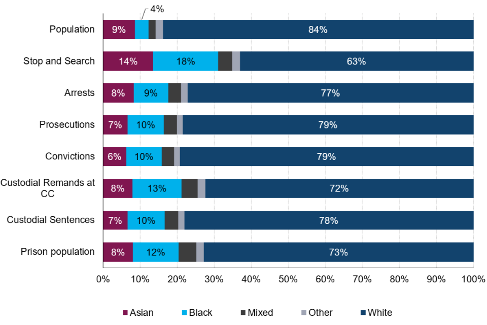 In general, ethnic minorities (excluding white minorities) appear to be over-represented at many stages throughout the CJS compared with the white ethnic group. This is especially apparent when comparing to the ethnic breakdown of the population of England and Wales[footnote 1]. The greatest disparity appears at the point of stop and search, custodial remands and prison population. Among ethnic minorities (excluding white minorities), black individuals were often the most over-represented. At various points across the CJS, the disparity holds for children from ethnic minorities (excluding white minorities). Differences in outcomes between ethnic groups over time present a mixed picture, with disparity decreasing in some areas and widening in others.