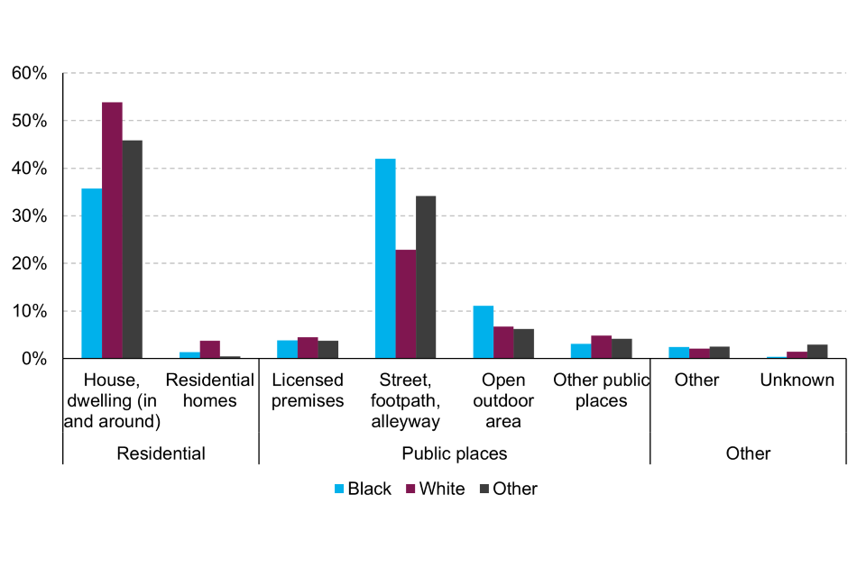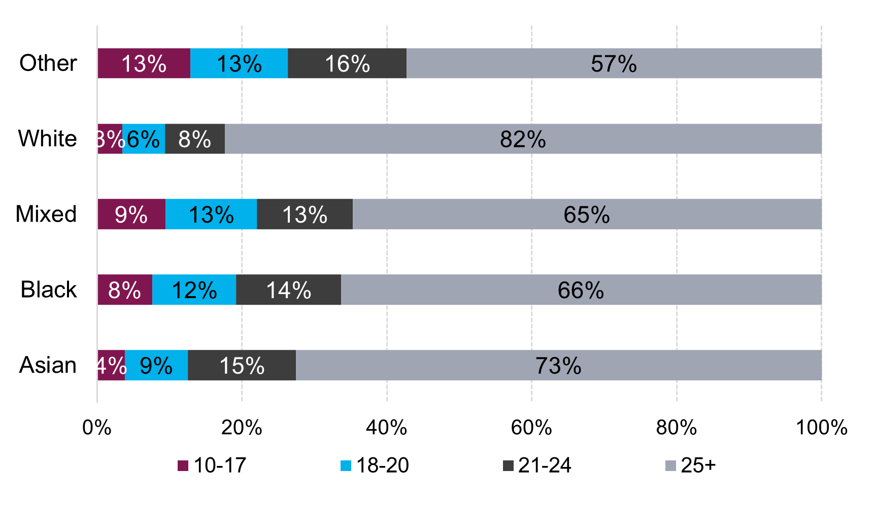 | Victims: A greater proportion of Black homicide victims were under 21. | In the last three years around a third Black victims were aged under 21, compared to 14% of White victims and 25% of Asian victims. |