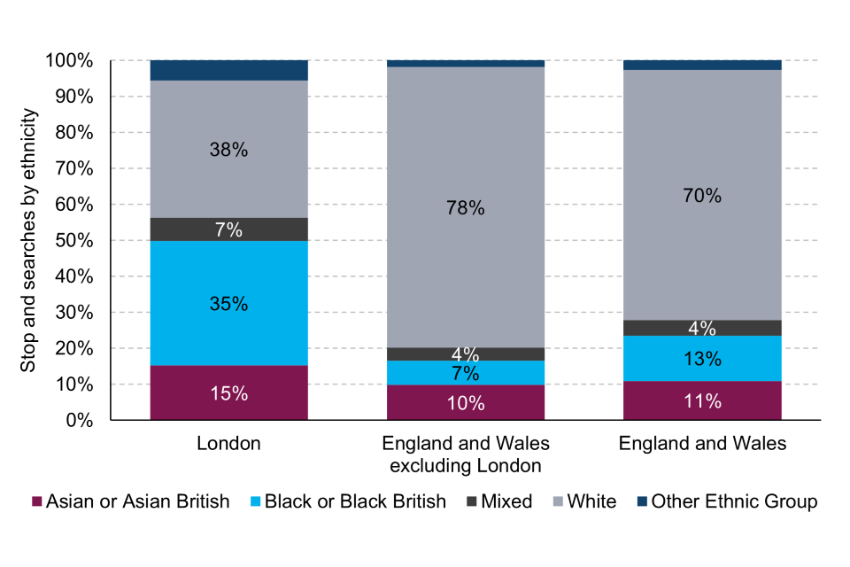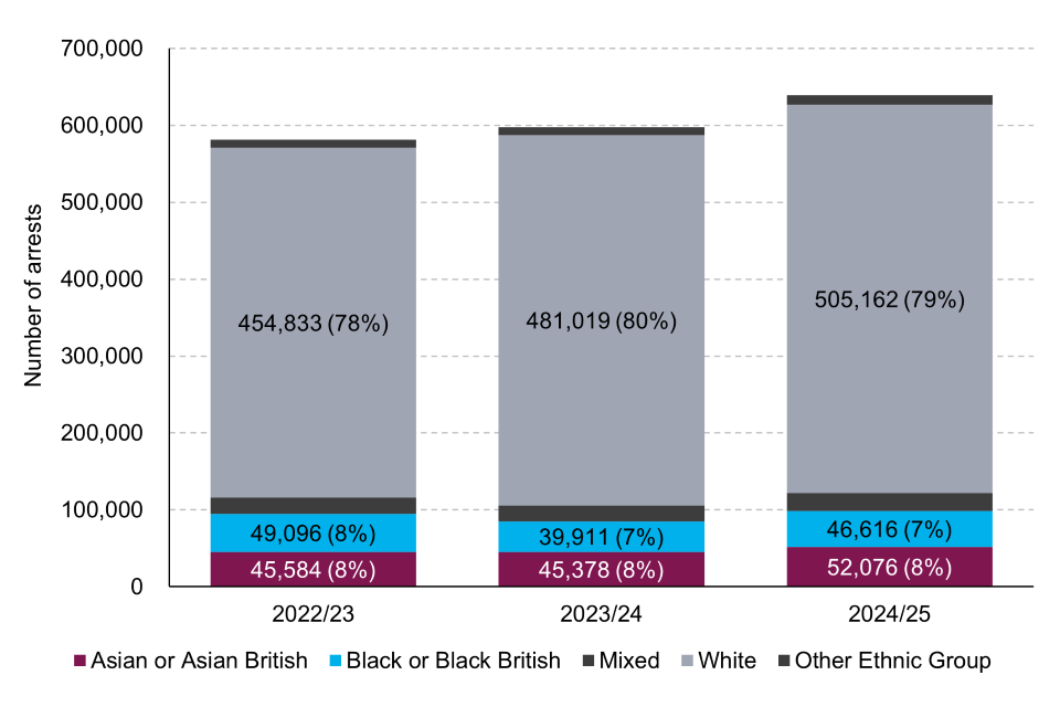 Includes City of London and Metropolitan Police forces. It should be noted that 61% of arrests in London had a not stated ethnicity in 2024/25 ↩