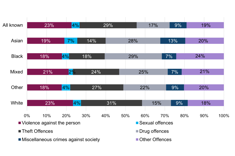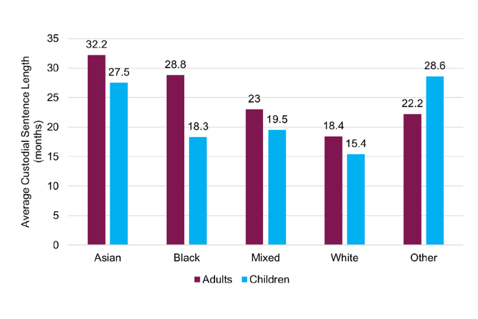 | Offender analysis: There was no statistically significant association between an offender’s ethnicity and the length of custodial sentences for indictable offences. | When analysed by offence group, some significant disparities were evident – most notably for drug offences, where offenders from Asian, Black and Mixed ethnic groups received longer median custodial sentences than White offenders. |