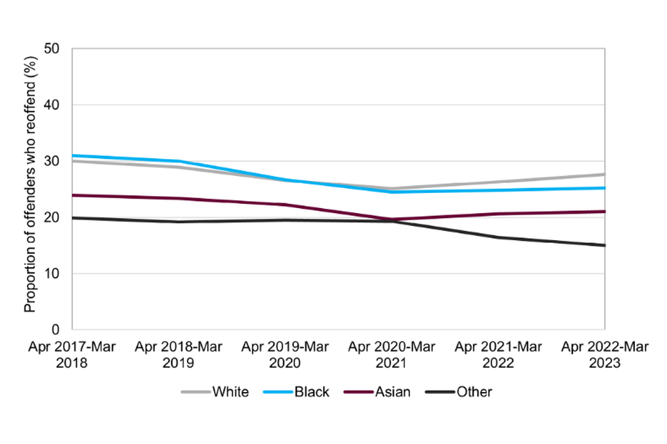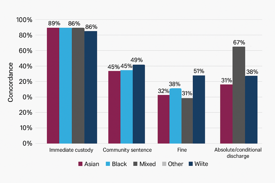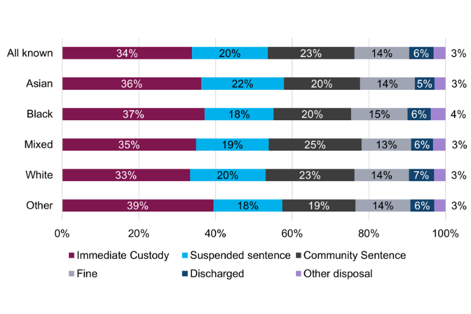 | Offender analysis: Offenders from Black and Other ethnic groups had significantly higher odds of receiving a custodial sentence compared to White offenders, while those from Asian ethnic groups had significantly lower odds, although the magnitude of these differences was small. | Over the past five years, there is no consistent pattern of significant differences in the odds of receiving a custodial sentence by ethnicity. However, in certain years there are individual differences that are significant and some groups displayed more stable associations than others. |