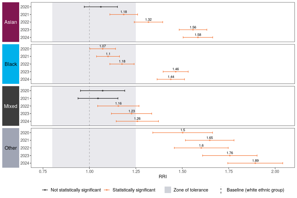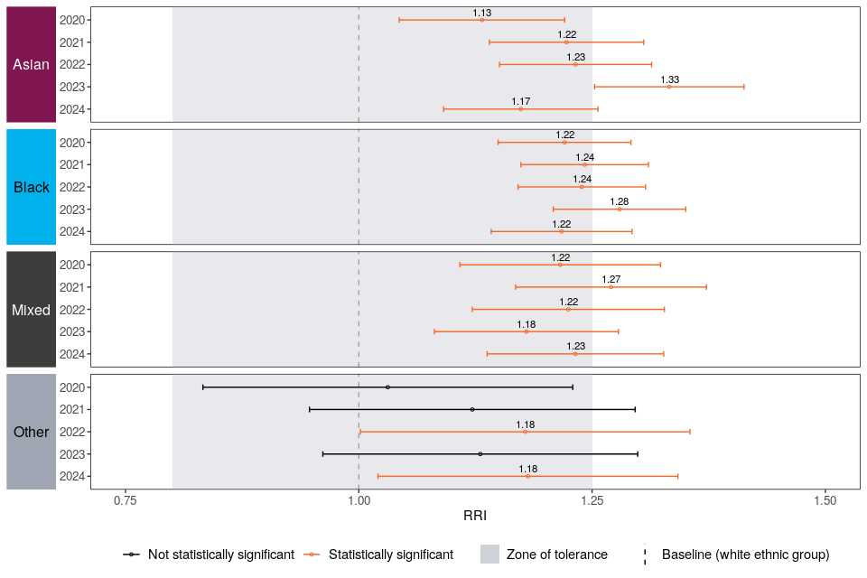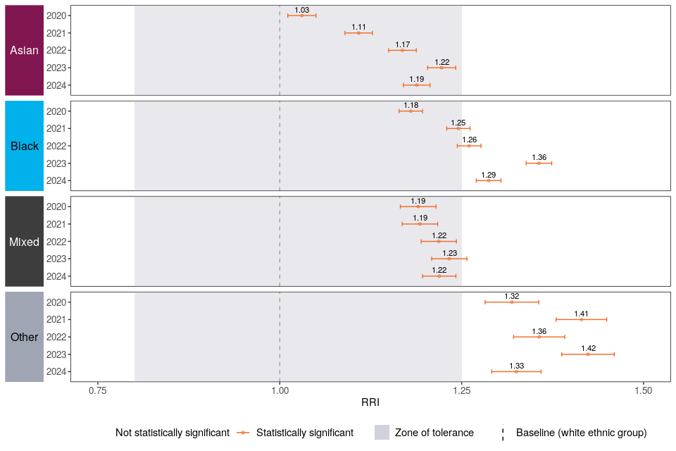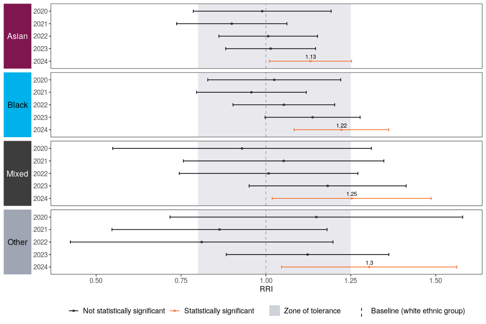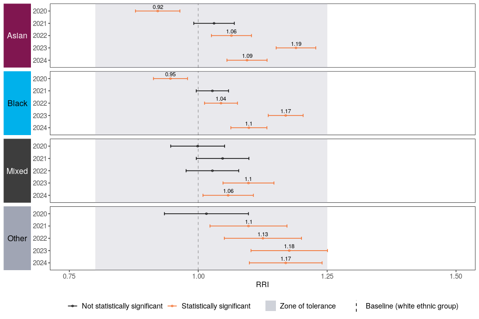 All groups defined by officer-identified ethnicity classification – see the technical guide. ↩