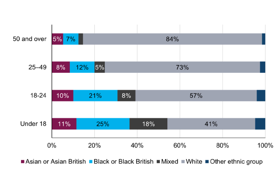 | Offender Management: A greater proportion of children in prison were from minority ethnic groups. | The ethnicity of prisoners varied by age groups - a higher proportion of young prisoners were from minority ethnic groups. In contrast, 84% of prisoners aged 50+ were White. |