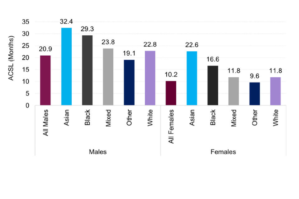 | Defendants: The average custodial sentence length (ACSL) continued to be lower for White defendants. | The ACSL was 18.4 months for White defendants, compared to 32.2 months for Asian defendants, 28.6 months for Black defendants, 22.9 months for Mixed ethnic group defendants and 22.2 months for the Other ethnic group. |