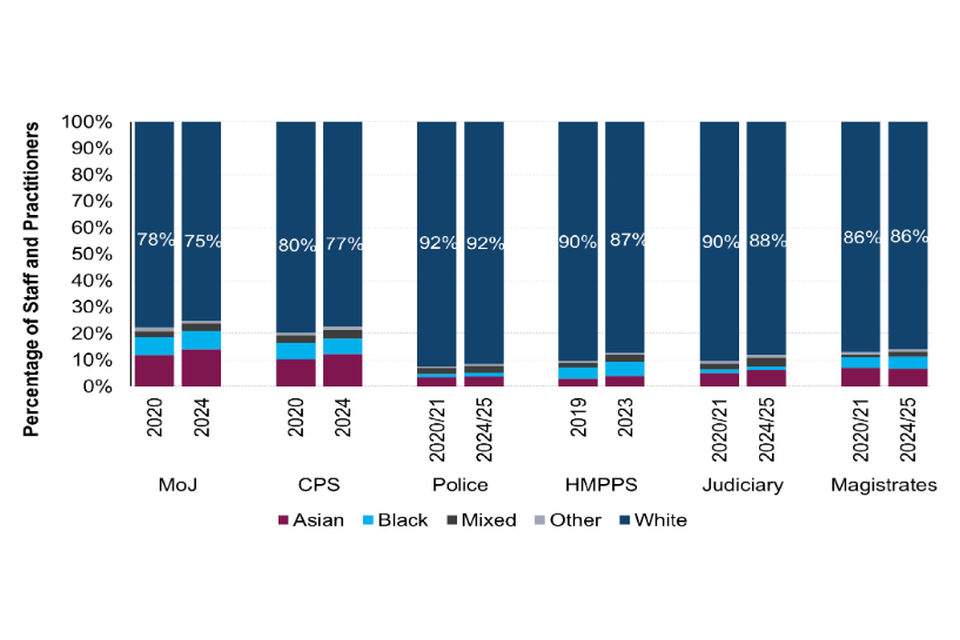 | Practitioners: The ethnic profile of practitioners in the Criminal Justice System (CJS) has become slightly more diverse over the last 5 years. | The proportion of staff from White backgrounds has decreased between 1 and 3 % across all CJS organisations over the last 5 years. |