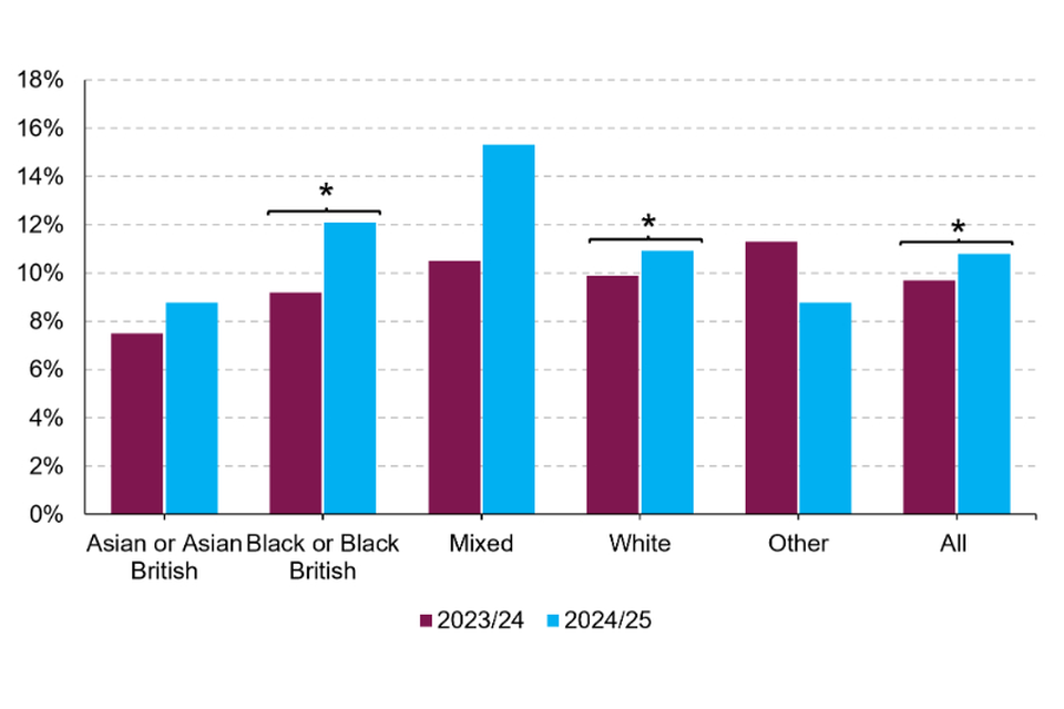 There were statistically significant increases in the prevalence of personal crime victimisation (including fraud) in the Black (from 9.2% to 12.1% in 2024/25) and White (from 9.9% to 10.9% in 2024/25) ethnic groups.