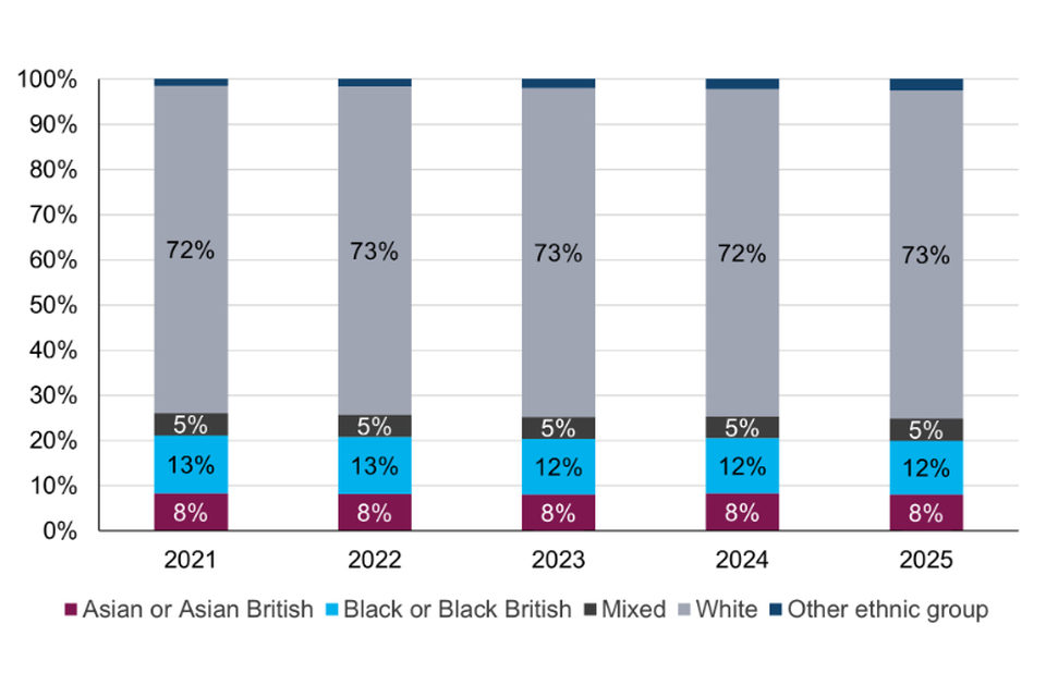 Data are self-declared from Home Office, as at March 2025 where ethnicity was known, some small discrepancies may result from revisions of data for previous years compared to figures here. Ethnicity was not stated in 3% of records in 2025. ↩