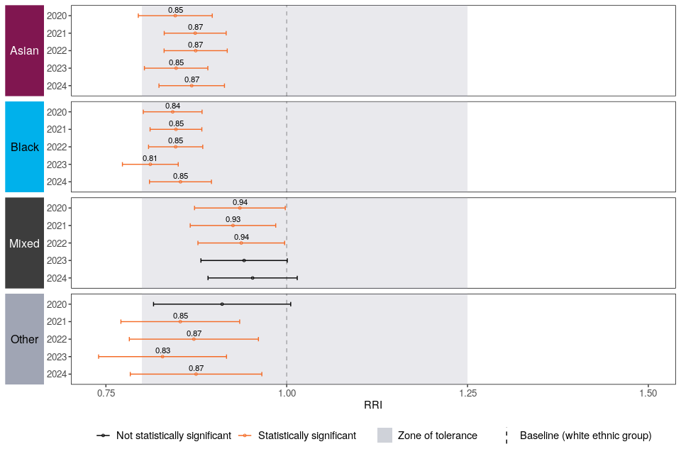 Results show that over the past five years, there is no consistent pattern of significant differences in the odds of receiving a custodial sentence by ethnicity. In certain years there are individual differences that are significant, and some groups displayed more stable associations than others – in the latest year there was a statistically significant association for offenders of Black and Other ethnic groups with increased odds of receiving a custodial sentence, compared to White offenders.