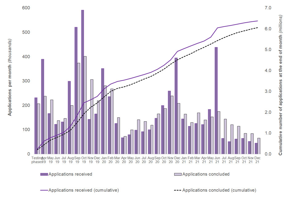 It is estimated that a total of 5,336,500 EEA and Swiss applicants and 407,400 non-EEA applicants had applied to the scheme up to 31 December 2021 [footnote 2].