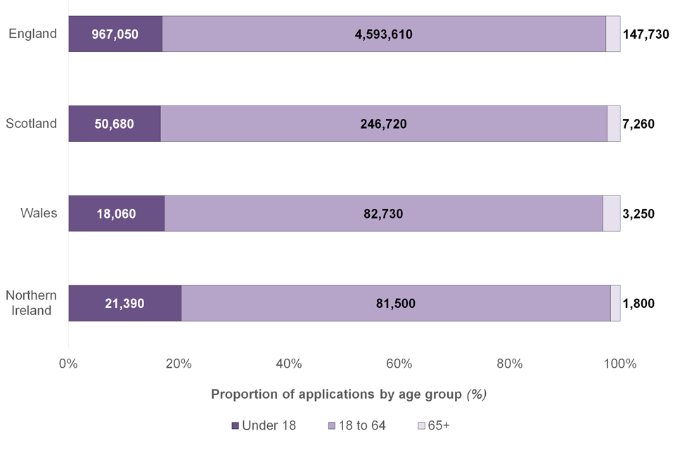 The majority of concluded applications were received from England (5,435,180; 90%), with an additional 294,120 from Scotland (5%), 99,860 from Wales (2%) and 98,660 from Northern Ireland (2%).