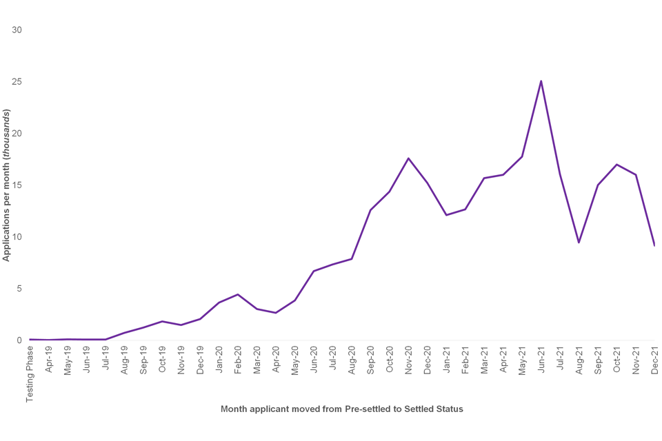 Figure 2 below shows the number of applicants who have moved from pre-settled to settled status per month since the launch of the scheme. There has been a steady increase in numbers from December 2019 onwards with June 2021 seeing the largest number of people moving from pre-settled to settled status (25,060 applicants). This coincided with the 30 June 2021 deadline which saw the 3rd largest volume of applications per month to the scheme (438,260) overall. December 2021 saw a dip in these figures (9,160), which reflected the low number of applications for that month.