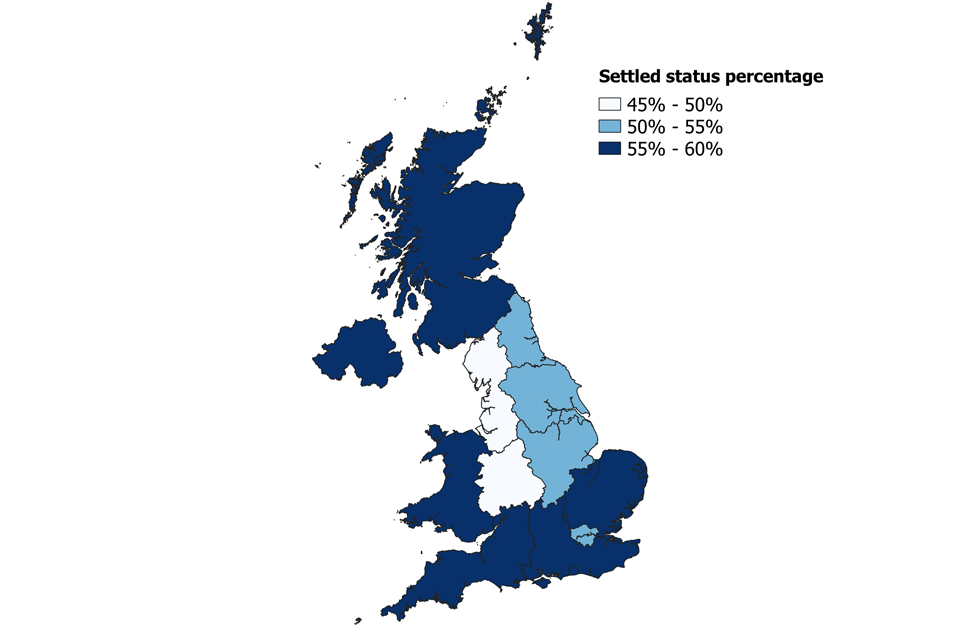 Figure 6- Settled status proportion of grants by region for the whole of the UK