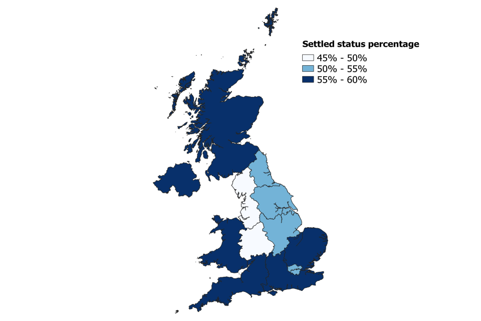 Figure 4 shows the proportion of concluded settled status applications by region with the North West, North East and Yorkshire and The Humber having the lowest proportions (45% to 50%) of settled status. This has been stable for some time.
