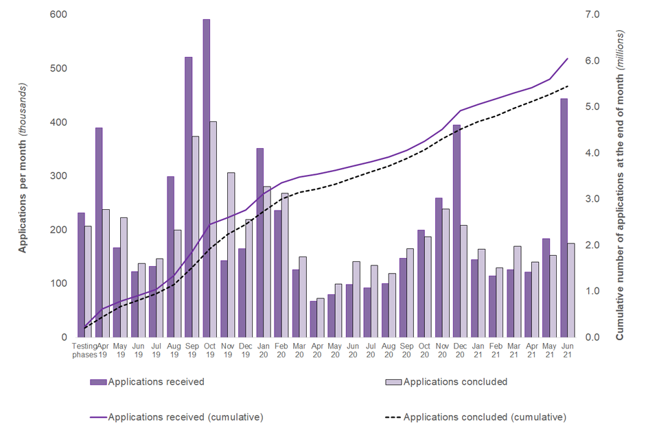 This indicates that an estimated 5,548,440 people had applied to the scheme up to 30 June 2021, with over 4.9 million obtaining a grant of status.