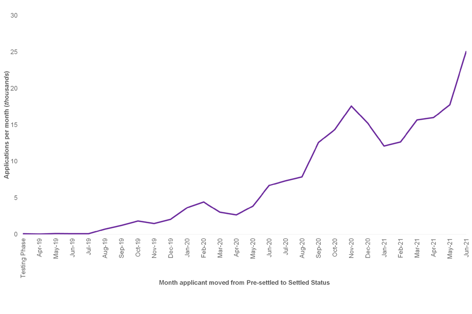 Figure 2 below shows the number of applicants who have moved from Pre-settled to Settled status per month since the launch of the scheme. There has been a steady increase in numbers from December 2018 onwards with June 2021 seeing the largest number of people moving from Pre-settled to Settled status so far (25,060 applicants).