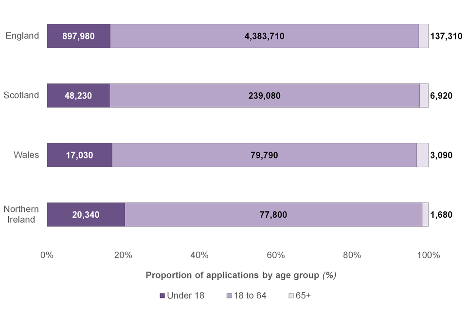 There were just over 1 million (1,002,280) applications received from people under 18 years of age, 4.9 million (4,896,420) applications from those aged 18 to 64 and 152,120 applications from those aged 65 and above (17%, 81% and 3%, respectively). Northern Ireland had a noticeably higher proportion (20%) of applications from people under 18 compared to the rest of the UK (average of 16% for each nation).