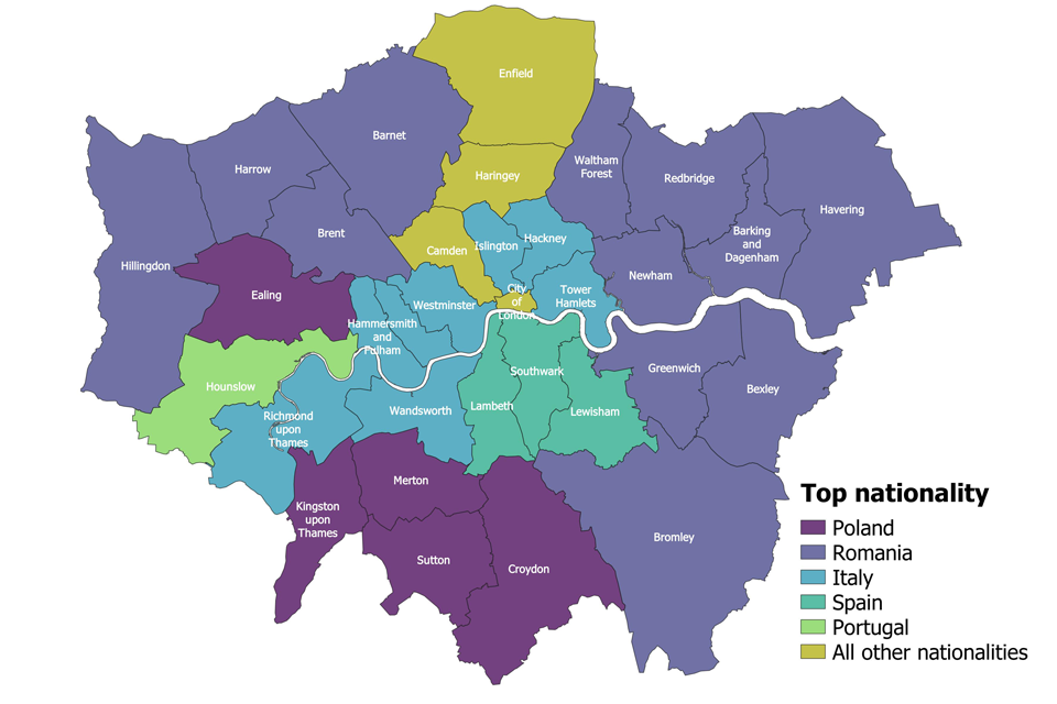 As of 30 June 2021, of all local authorities, Ealing had the highest number of applications from Polish nationals (26,290), Newham from Romanian nationals (44,150) and Tower Hamlets from Italian nationals (21.910).