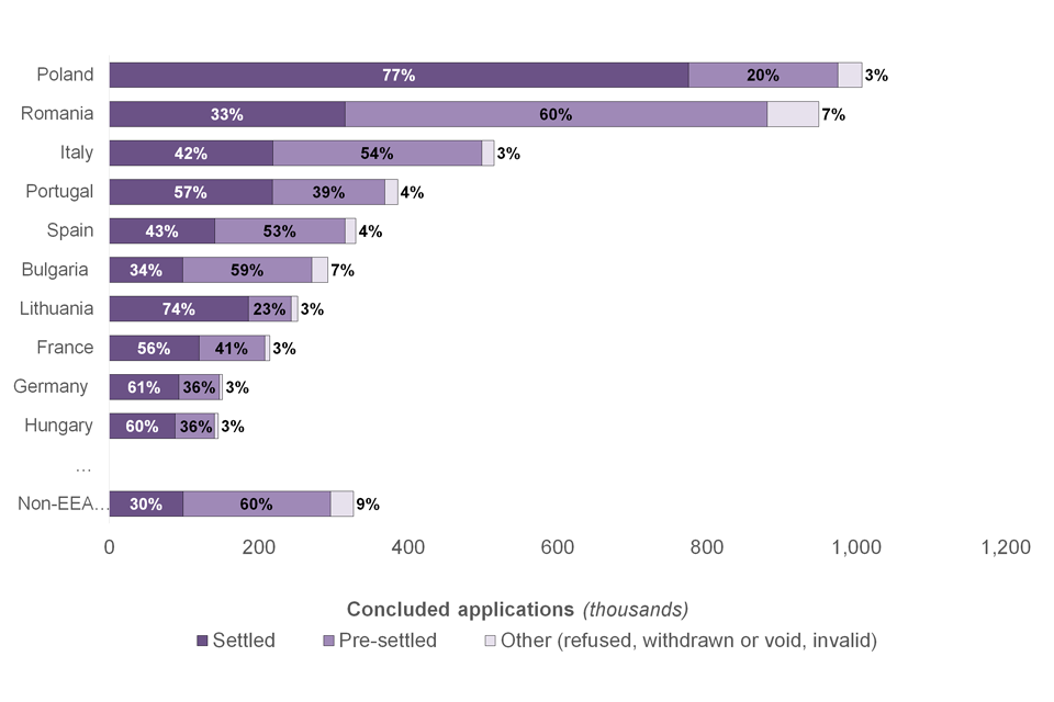 As seen in Figure 5, there were 5,065,570 concluded applications from EU nationals, 52,320 from other EEA and Swiss nationals, and 326,600 from non-EEA nationals. Similar to the number of applications received, the nationalities with the highest number of concluded applications were: