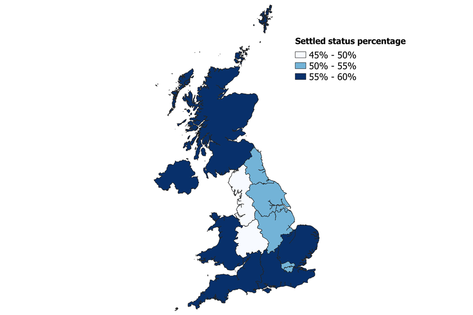 Figure 6- Settled status proportion of grants by region for the whole of the UK