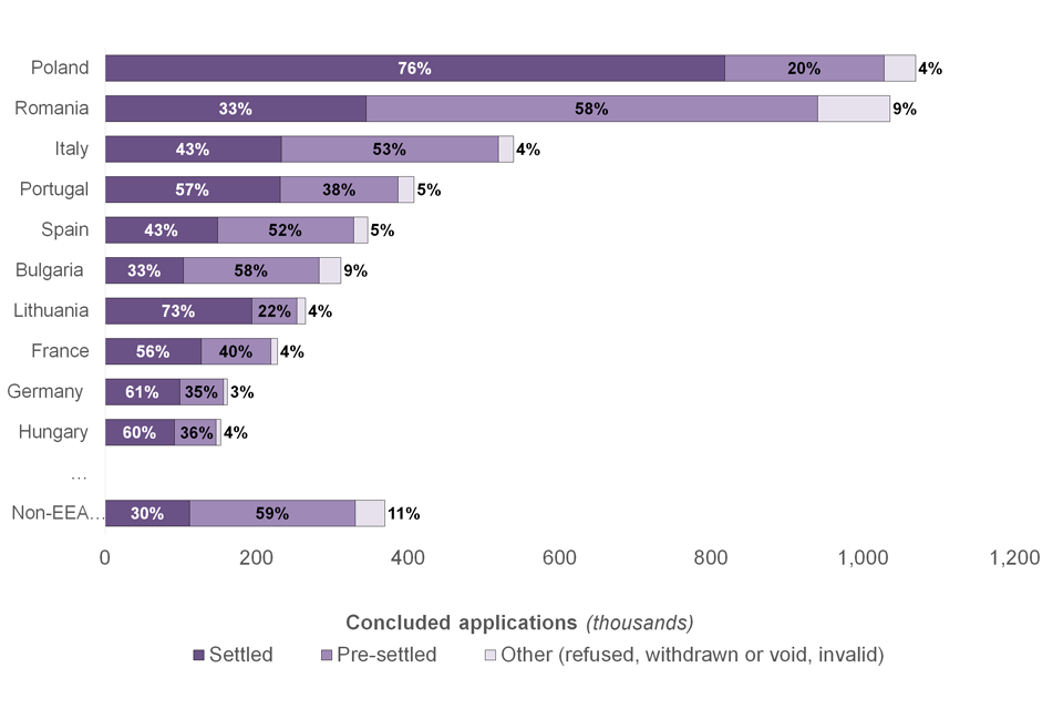 As seen in Figure 7, there were 5,395,850 concluded applications from EU nationals, 57,620 from other EEA and Swiss nationals, and 369,520 from non-EEA nationals. Similar to the number of applications received, the nationalities with the highest number of concluded applications were: