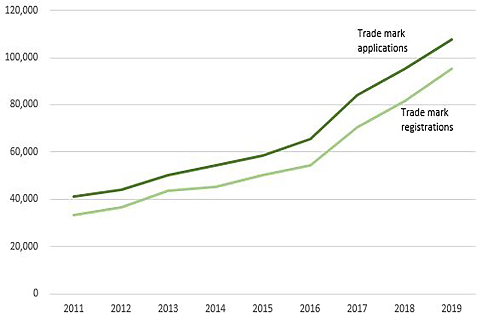 In 2019, the IPO received a record 107,527 trade mark applications, a 12.9% increase from 2018. Both the number of applications and trade marks registered have increased year-on-year since 2011.