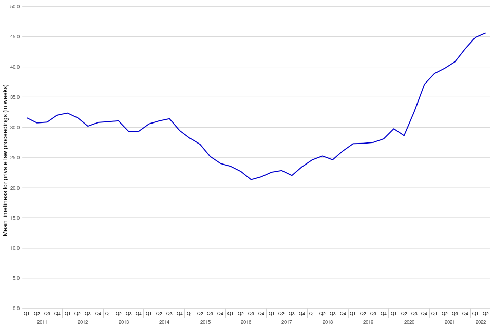 Under the old divorce law, the mean average time from the date of petition to decree nisi was 36 weeks, up 12 weeks from the same period in 2021. The mean average time from petition to decree absolute was 56 weeks, up 7 weeks from the equivalent quarter in 2021. These increases have been impacted by resourcing issues which have led to backlogs.