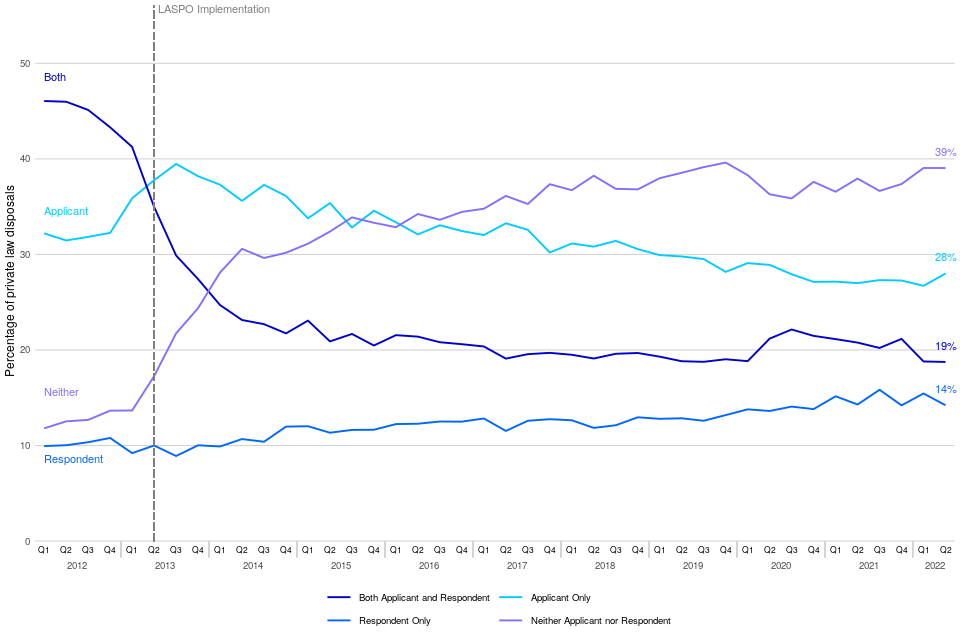 Correspondingly, the proportion of cases where both parties had legal representation went from 41% in January to March 2013 to 19% in April to June 2022, down 2 percentage points compared to the same period in 2021 (Figure 4).