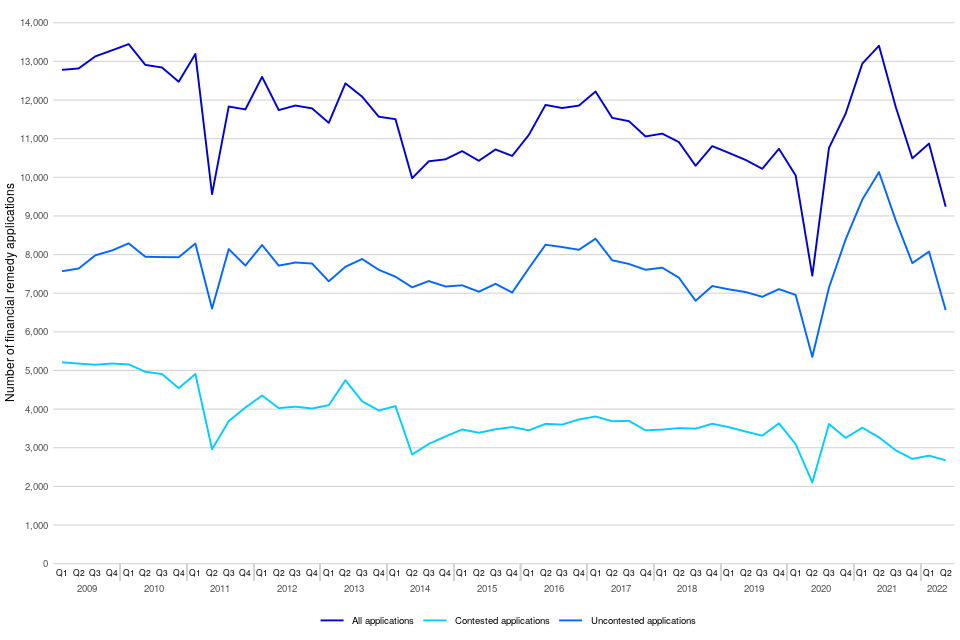 There were 9,235 financial remedy applications made in April to June 2022, down 31% from the same period in 2021, while there were 8,253 financial remedy disposals events, down 26%. During this period, 71% of applications were uncontested and 29% were contested.