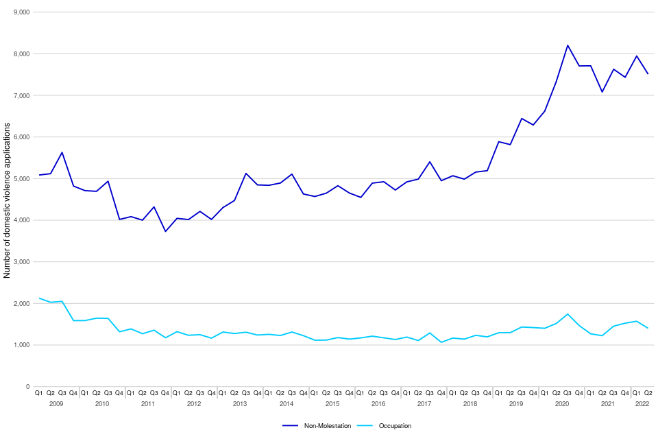 In April to June 2022, there were 7,791 domestic violence remedy applications, up by 6% on the same quarter in 2021 requesting a total of 8,911 orders (multiple orders can be applied for in a single application). Most of the orders applied for were non-molestation orders (84%) compared to occupation orders (16%); these proportions have remained relatively consistent in recent years. Applications for non-molestation and occupation orders in April to June 2022 were both up, by 6% and 15% respectively, compared to the same period in 2021.