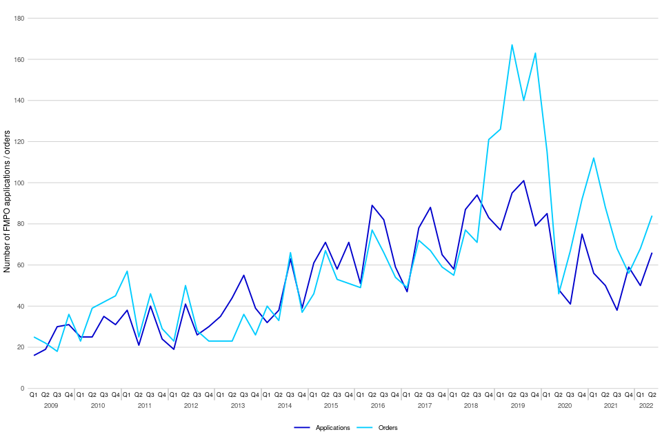Figure 8: Applications and orders made for Forced Marriage Protection Orders, January to March 2009 to April to June 2022 (Source: Table 17)