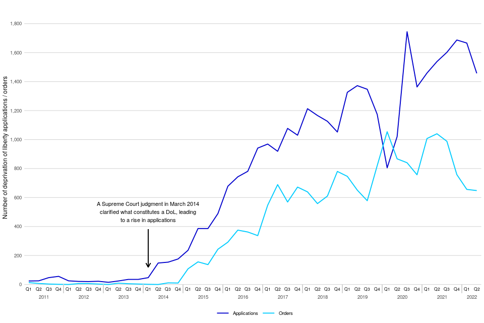 There were 1,457 applications relating to deprivation of liberty made in the most recent quarter, which is a decrease of 5% on the number made in the same quarter in 2021. Furthermore, there was a decrease by 38% in the orders made for deprivation of liberty over the same period from 1,040 to 648.