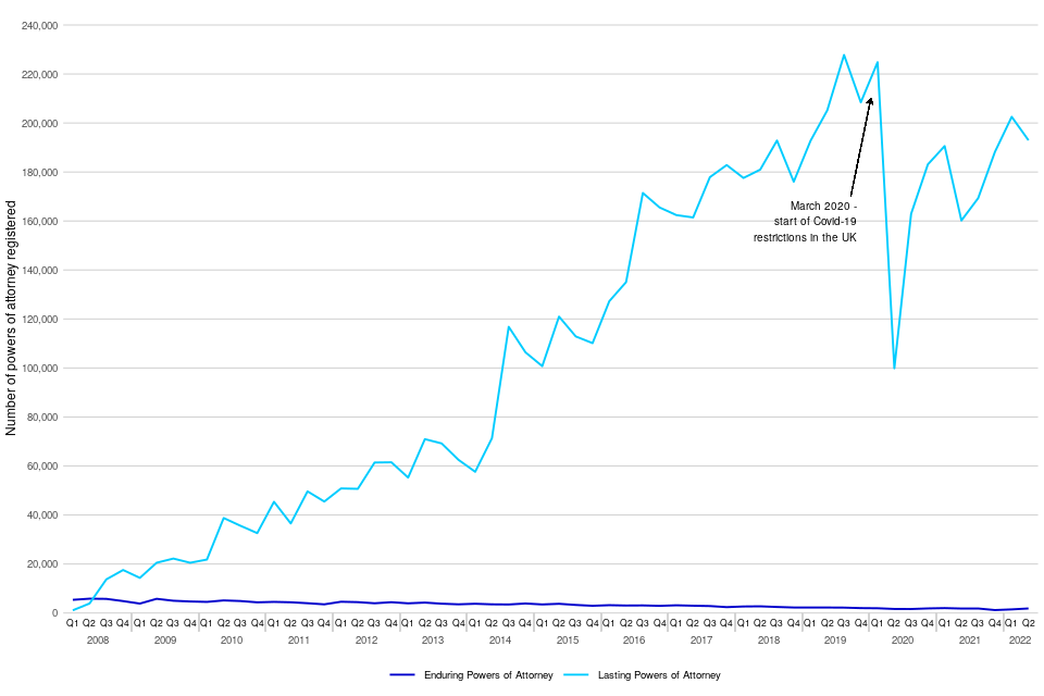 Figure 11: Powers of Attorney registered, January to March 2008 to April to June 2022 (Source: Table 23)