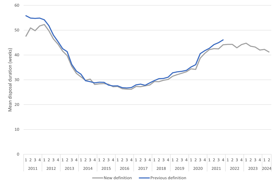 Figure B : Mean disposal duration for Public Law Cases comparing the previous definition to the new definition, January to March 2011 to April to June 2024 (Source: Table 10)