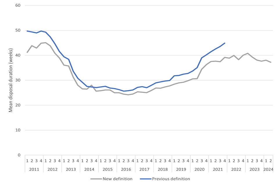 The mean average time for private law cases to reach first disposal was 29 weeks, down 2 weeks compared to the same period in 2023. Public law cases also decreased in time compared with the same quarter last year, down 2 weeks to 37 weeks.