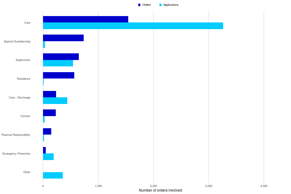 Figure 2: Public law applications and orders made, by order type, January to March 2022 (Source: Tables 3-4)