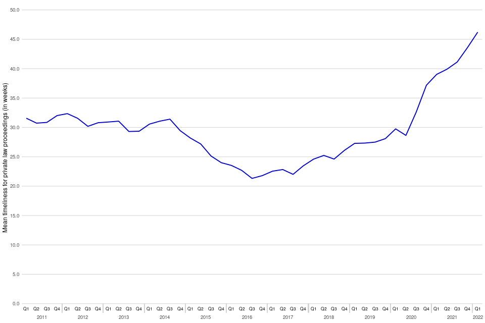 In January to March 2022, it took on average 46 weeks for private law cases to reach a final order, i.e. case closure, up 7 weeks from the same period in 2021 and the highest value in the series. This continues the upward trend seen since the middle of 2016, where the number of new cases overtook the number of cases disposed (Table 9).