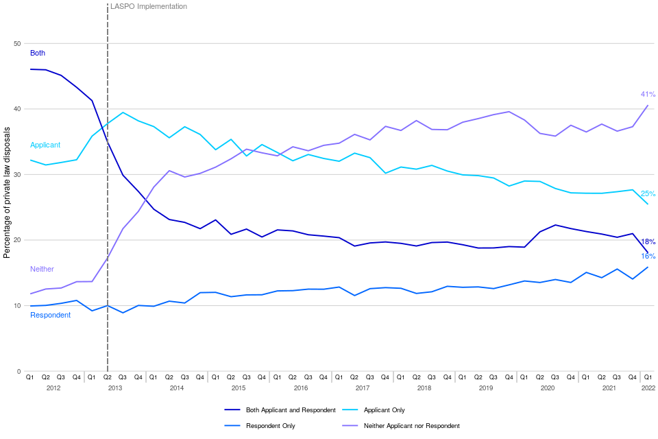 The removal of legal aid for many private law cases in April 2013 resulted in a change in the pattern of legal representation over time[footnote 4],[footnote 5]. In January to March 2022, the proportion of disposals where neither the applicant nor respondent had legal representation was 41%, increasing by 27 percentage points since January to March 2013, and up 4 percentage points from January to March 2021.