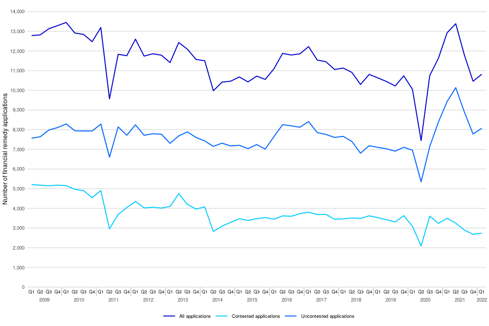 There were 10,815 financial remedy applications made in January to March 2022, down 16% from the same period in 2021, while there were 11,083 financial remedy disposals events, down 10%. During this period, 75% of applications were uncontested and 25% were contested.