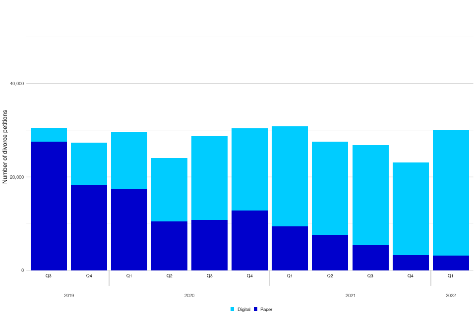 For digital divorce cases (i.e. those dealt with the Courts and Tribunals Service Centres that are digital at all stages), there were 26,973 petitions made during January to March 2022 (89% of the total, up from 69% in the same period of 2021). The average time to decree nisi for January to March 2022 was 14 weeks, and 28 weeks from petition to decree absolute.